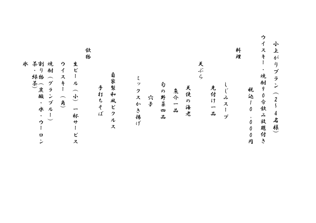 小上がりプランのご案内(2~4名様) 2025.11.24 小上がりをご利用のお客様のお得なプランです。 ウイスキー・焼酎の90分飲み放題付き! 詳細は画像をご確認ください。 ※ウイスキー・焼酎はボトルでご提供。お客様が作るシステムになります。 ※違う銘柄のウイスキー・焼酎、日本酒、ワイン、追加のビールなどプラン以外の飲物は別料金になります。 ※飲み放題のお時間は90分です。 ※お電話でのご予約必須。 Tweet Share Hatena feedly